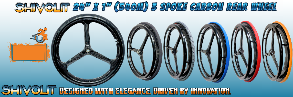 SHIVOLIT 24" x 1" (540m) 3 Spoke Carbon Wheel With Primo Passage Air-Pneumatic Tire and Aluminum Pushrim. Set of 2